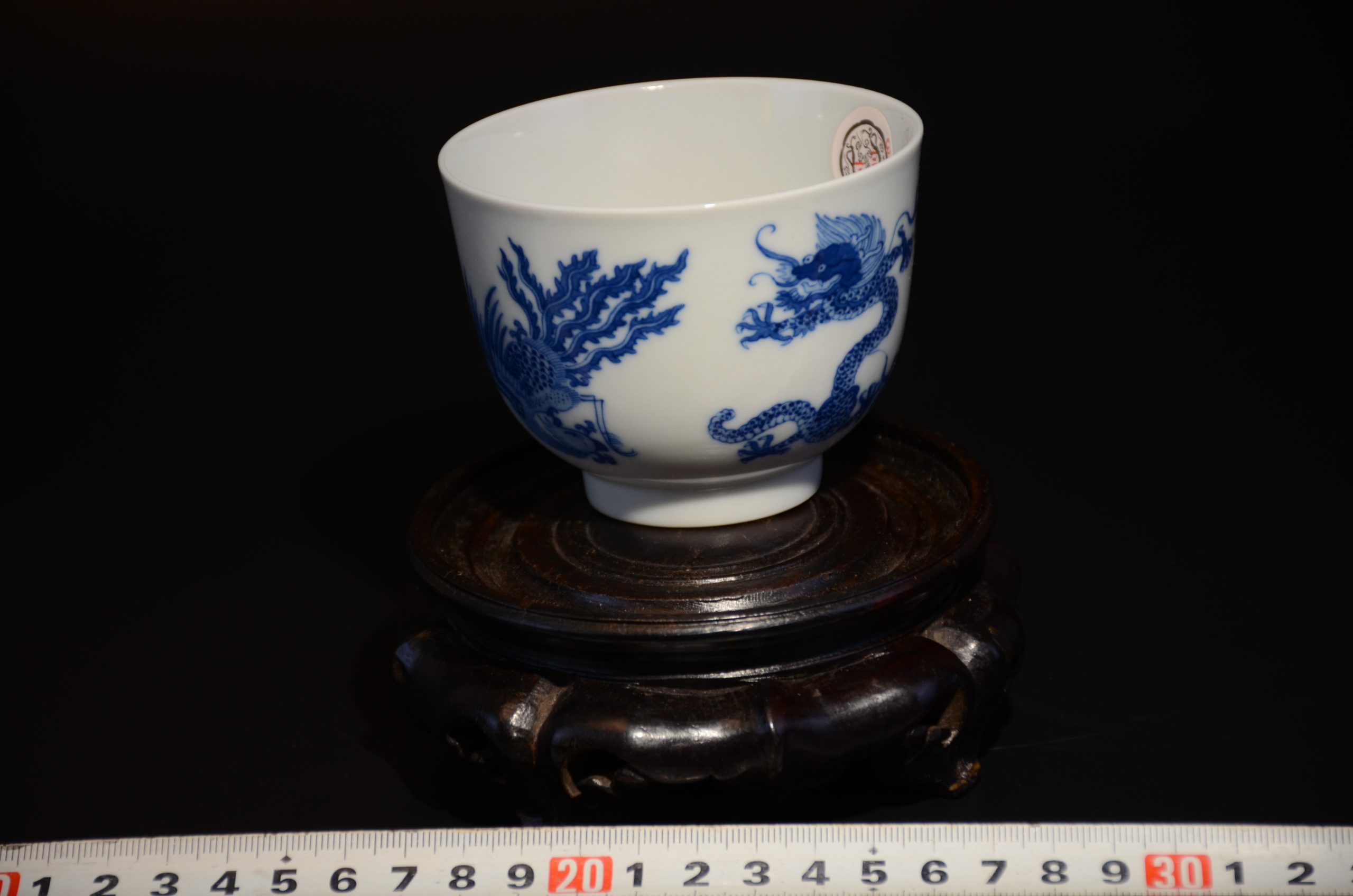 清乾隆,大清乾隆年制款,青花龙凤纹杯。Seal marks and period of Qianlong, Q